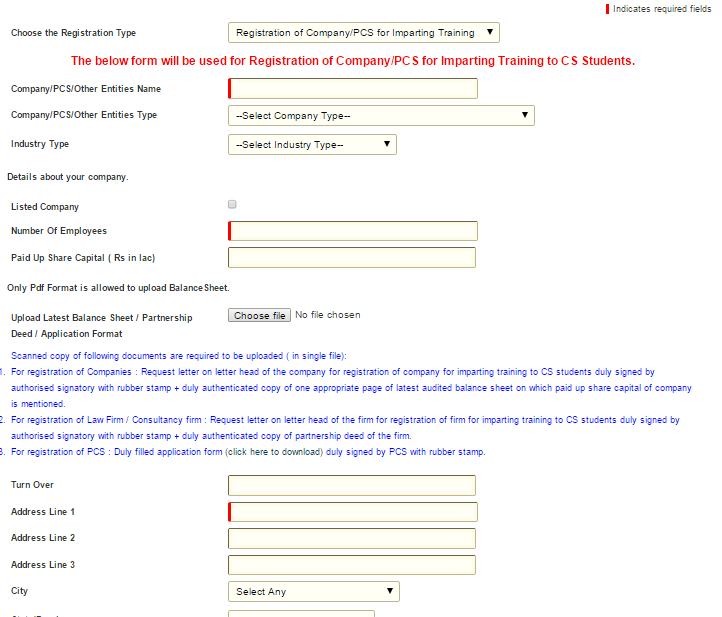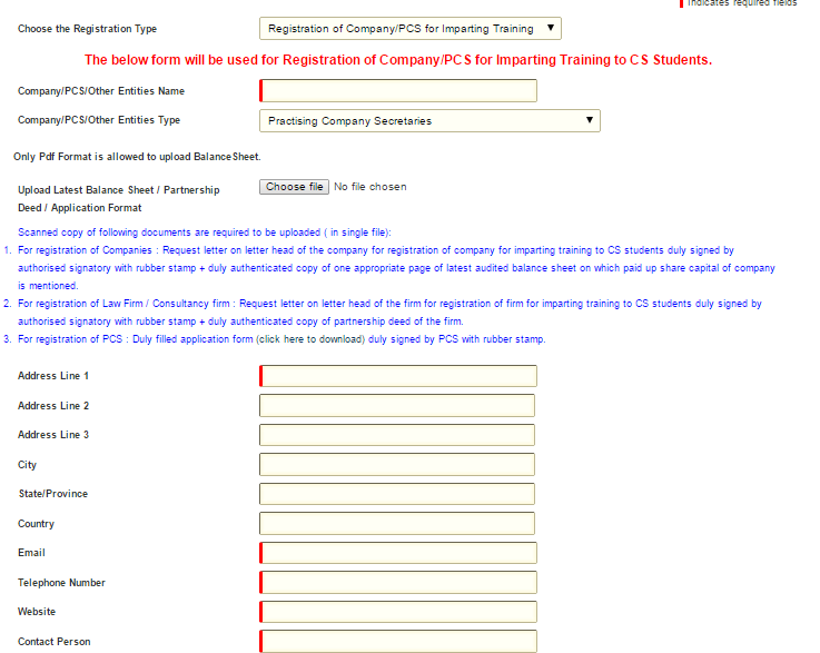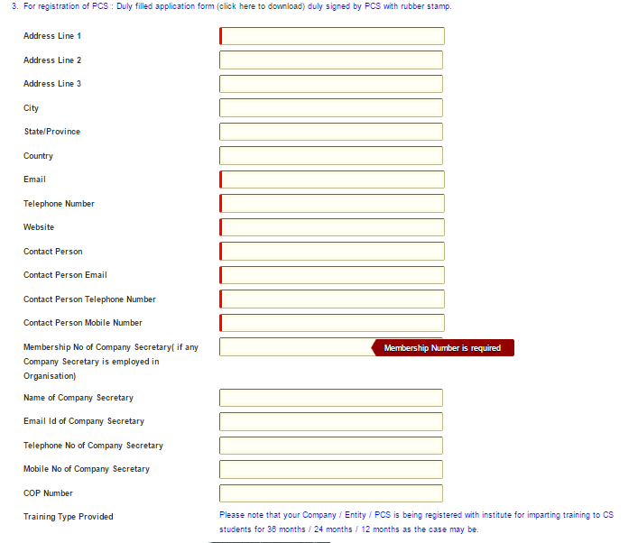 For filing a form, we all know all mandatory fields are mandatory not otherwise. Here, only a non – mandatory field is mandatory. Trainer has to select an option from drop down menu in non – mandatory field “Company/PCS/other entity type” and when “Practising Company Secretary” selected browser refresh itself and you witness drastic change in this online form: