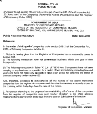 A copy of public notice issued against 71,530 companies by ROC – Mumbai read as under –
